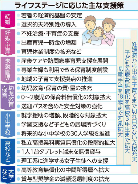 このほか、病気や障がい、不登校など「多様な子ども・子育て家庭への支援」や、性別や雇用形態による格差是正など「働き方と社会保障の転換」への施策も列挙した。